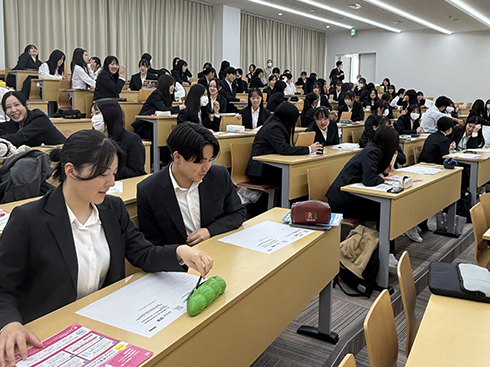 株式会社マイナビの方に講師としてお越しいただき、2年次生を対象とした「履歴書対策講座」と「面接対策講座」を、看護学科は2月19日(水)、医療介護福祉学科は2月18日(火)に開催しました。学生たちは、社会人として不可欠である基本ルールやマナーについて学ぶとともに、ワークシートを用いて自己PRと志望動機を言語化する作業に取り組みました。また、事前に作成していた自身の履歴書を広げ、講座で指摘されたことと照らし合わせながら加筆修正を行いました。面接練習ではペアワークも取り入れられており、評価シートに基づいて学生同士で練習に取り組みました。採用試験の要となる履歴書作成や面接試験の対策について学ぶ機会を得て、就活本番に向けた意識の向上と準備の進展につながったようです。